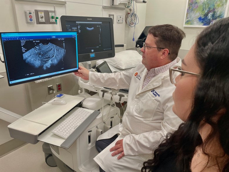 Dr. Patrick Ramsey and Bianca Chavarria discuss the sonogram that shows her placenta growing into her uterus. Credit: Courtesy / University Health