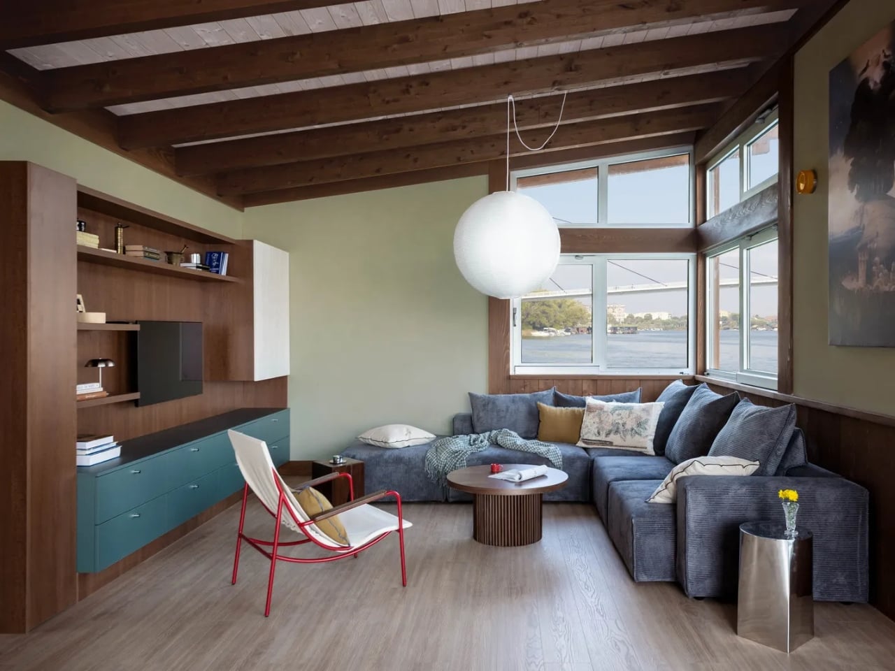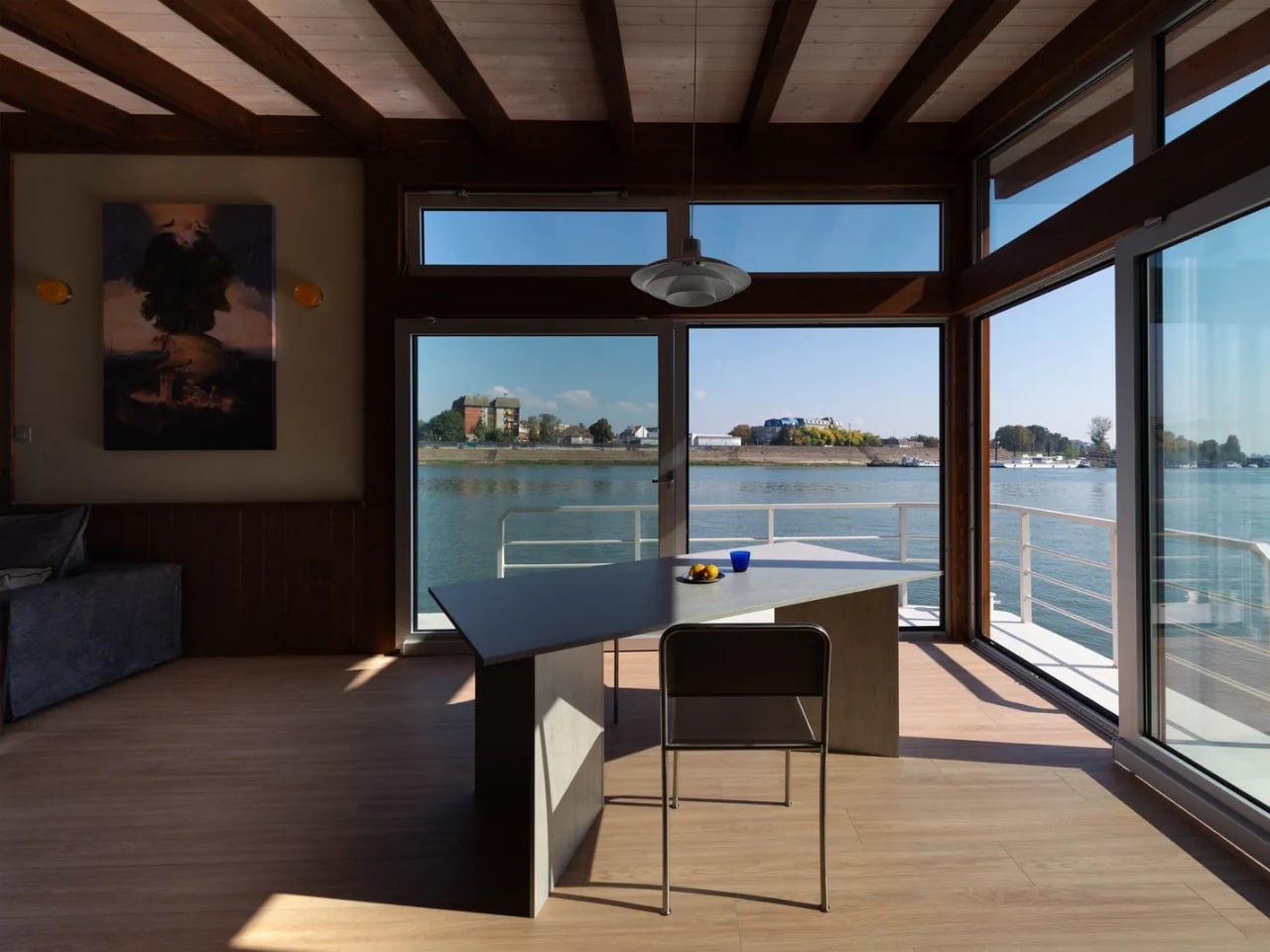 The interior features continue the nautical theme with sculptural quality and attention to detail. Dark cabinetry grounds the space, while the interplay of textures (smooth metal fixtures against warm wood surfaces) creates visual interest without overwhelming the compact footprint. Every element serves dual purposes: beauty and function coexist in perfect harmony. The thoughtful material choices extend to every surface, creating a cohesive environment where you can truly unwind. Imagine spending your afternoons here with a good book, watching the river flow by, or gathering around the table for long conversations with friends over wine and home-cooked meals.