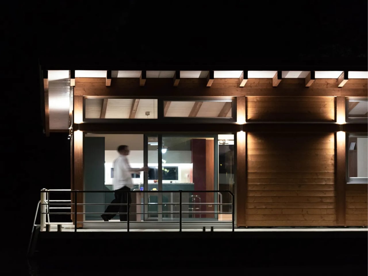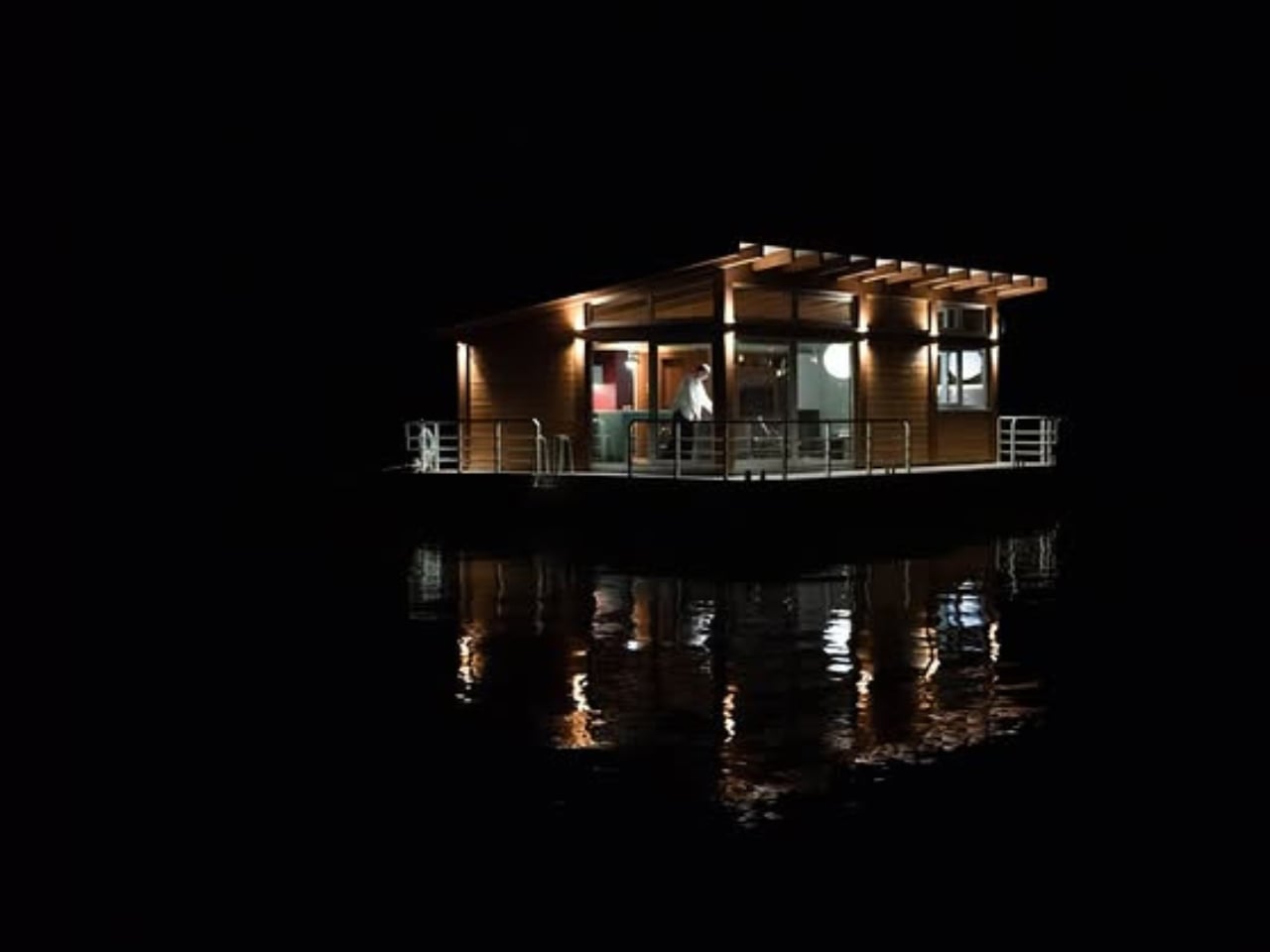 The architectural language of the cabin speaks to its unique floating nature. The stationary pontoon provides a stable foundation while maintaining that gentle connection to the water’s movement. The structure’s proportions were carefully calculated to balance comfort with the intimate scale appropriate for a riverside retreat. The exterior showcases a disciplined palette that allows the cabin to feel both contemporary and timeless, never competing with its natural surroundings.