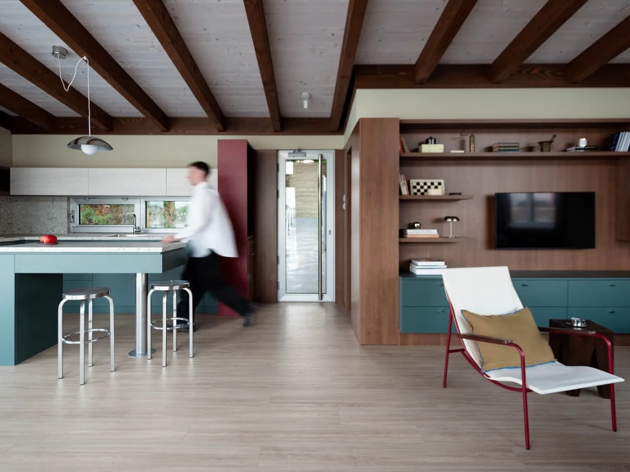 The design is inspired by the riverside setting and the old shipyards in the area, paying tribute to the maritime heritage of the site. It uses a combination of wood and metal, giving off a textural contrast and adding to the charm of the cabin. You get deep greens to mirror the water hues and red accents as a nod to nautical navigation markers. This way, you have an honest, grounded aesthetic to mirror the landscape where the retreat stands on.