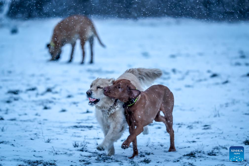 Dogs play in the snow in Budapest, Hungary on Jan. 5, 2026. (Photo by David Balogh/Xinhua)