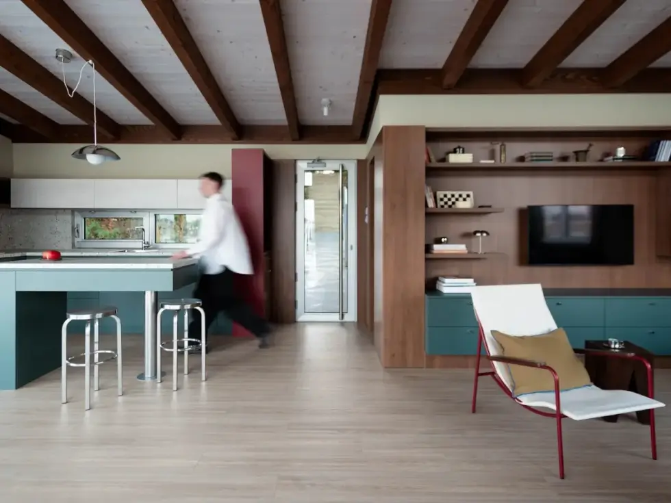 The clients intend to use it as a gathering place for family and friends. The open floor plan, full-height glazing, and clerestory windows make the interiors feel spacious. Its construction mostly uses wood and metal to reportedly reflect the maritime influences of the area. It features a living room with a large L-shaped sofa, a kitchen, and a bathroom.