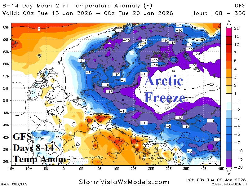 Discussion: Very cold weather is developing across France and Northwest Eurasia to begin the New Year (Fig. 1). The GFS 1-7-day forecast indicates expansive cold to very cold weather enhanced by widespread above normal snow cover (Fig. 2). Both GFS and ECM agree that arctic air becomes involved in the 8-14-day period adhering to East Europe and West Russia (Fig. 3). Snow cover is above normal as indicated by GFS for midday today (Fig. 4) and increases/deepens over the next 2 weeks (Fig. 5). A strip of stratospheric warming across Southern Eurasia inspires the frigid weather pattern enhanced by the deep snow cover. Probability is HIGH that 0F reaches Eastern Europe in the 6-10-day period. Very cold 10’s extends across Southwest Russia where ground is bare throughout the cold event raising crop concerns.