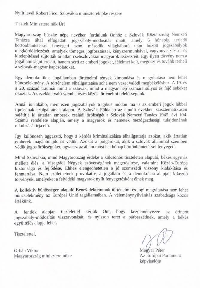 If you still consider yourself the Prime Minister of Hungary, please sign and forward a letter to Bratislava via the Ministry of Foreign Affairs without delay.