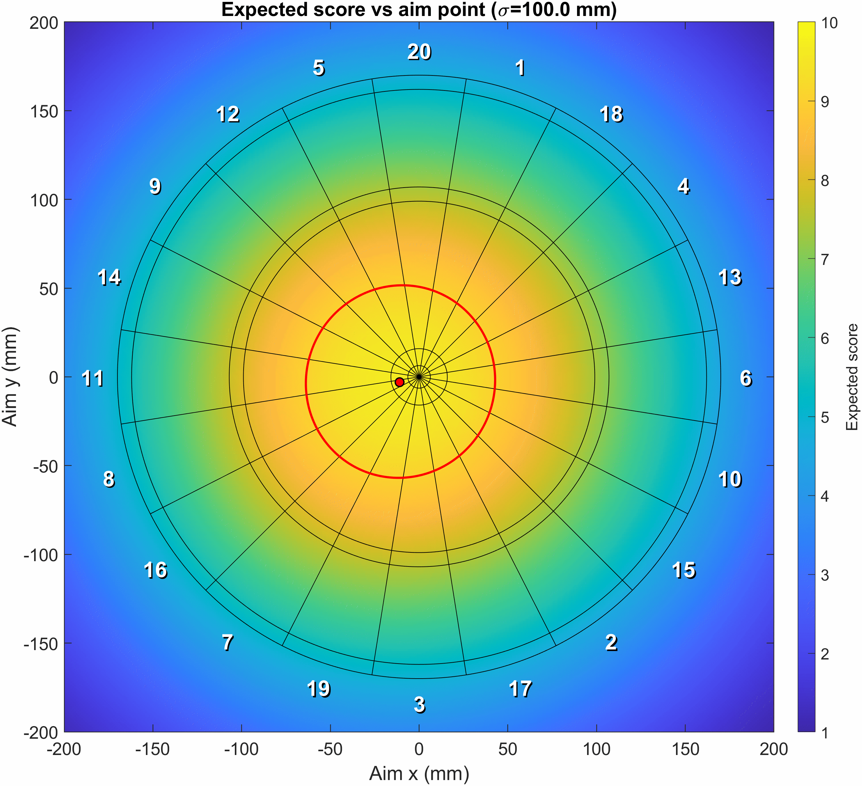 Would be interesting to see it with separate x and y accuracy – as a shit darts player I think x is easier than y so I usually aim for treble 14!