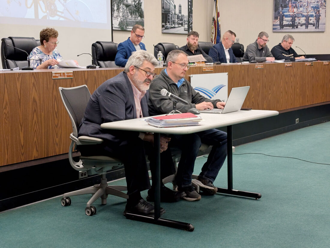 Mayor Tom Joyce, left, reads an opening statement at a public meeting on sanitation issues and proposed trash and recycling contracts Tuesday in Parkersburg City Council chambers as Finance Director Eric Jiles listens. (Photo by Evan Bevins)