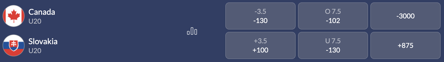 Team Canada is a heavy -3000 favourite to win on the WJC odds, with the puckline set at 3.5 goals and the total pegged at 7.5.