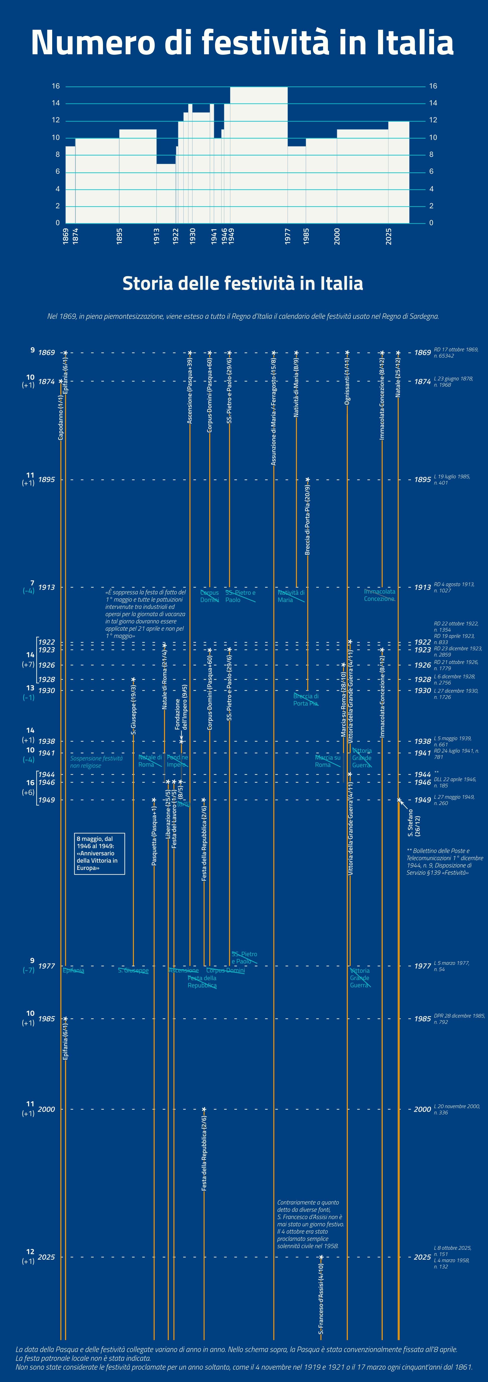 1. Lo schema parte dal Regio Decreto n. 65342 del 17 ottobre 1869 che estese a tutto il Regno d’Italia il calendario delle festività usato nel Regno di Sardegna.