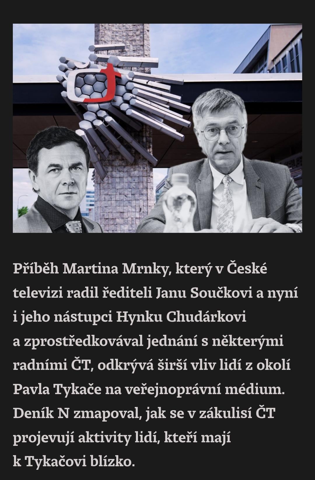 Martin Mrnka se poslední dobou v klíčových momentech opakovaně objevuje v zákulisí ČT – nejprve za éry generálního ředitele Jana Součka, nyní po jeho odvolání i u nového šéfa Hynka Chudárka. Deník N nyní zjistil, že s ním Česká televize za Chudárkova vedení uzavřela nové poradenské smlouvy. Z rozhovorů s několika lidmi z vedení televize i z byznysového prostředí zároveň vyplývá, že Mrnka není jediný: na dění ve veřejnoprávní televizi mají vliv i další lidé blízcí Tykačovi.