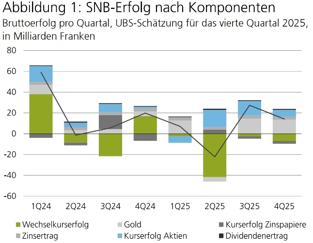 The SNB will publish its first figures for the 2025 annual result only on Friday. As usual, however, UBS economists have already issued an estimate in advance. The major bank assumes that the SNB generated a profit of 11 to 16 billion francs in the fourth quarter, implying a full-year profit in the range of 23.5 to 28.5 billion francs.