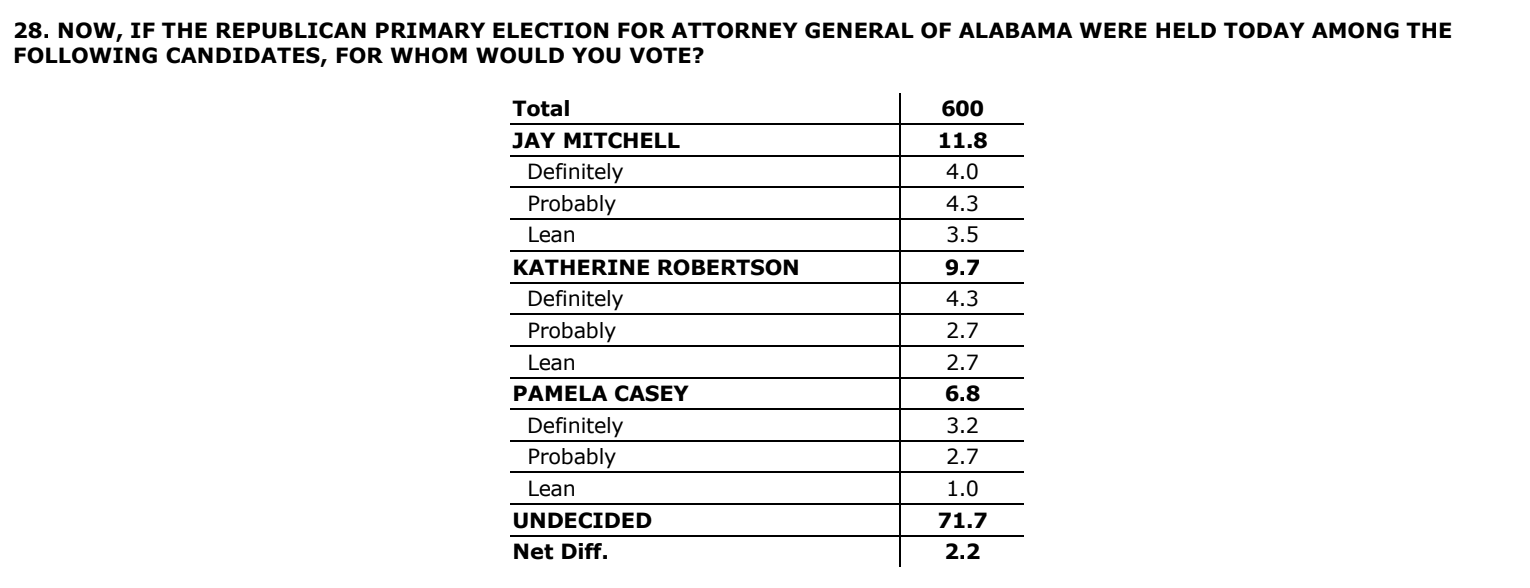 In the contest to be the GOP’s nominee for attorney general, 71.7% of respondents remain undecided. About 11.8% favored former Alabama Supreme Court associate justice Jay Mitchell while 9.7% said they’d vote for Katherine Robertson, who is chief counsel to current Attorney General State Marshall. Blount County District Attorney Pamela Casey has 6.8% of respondents’ support.