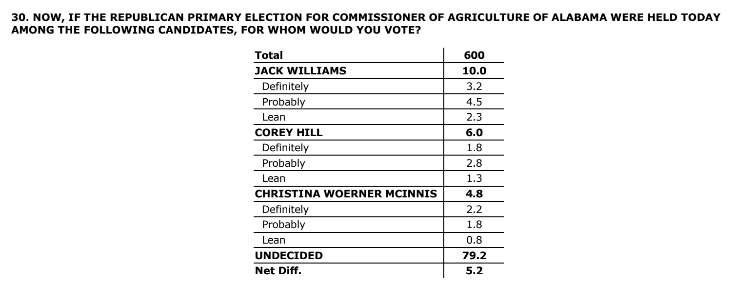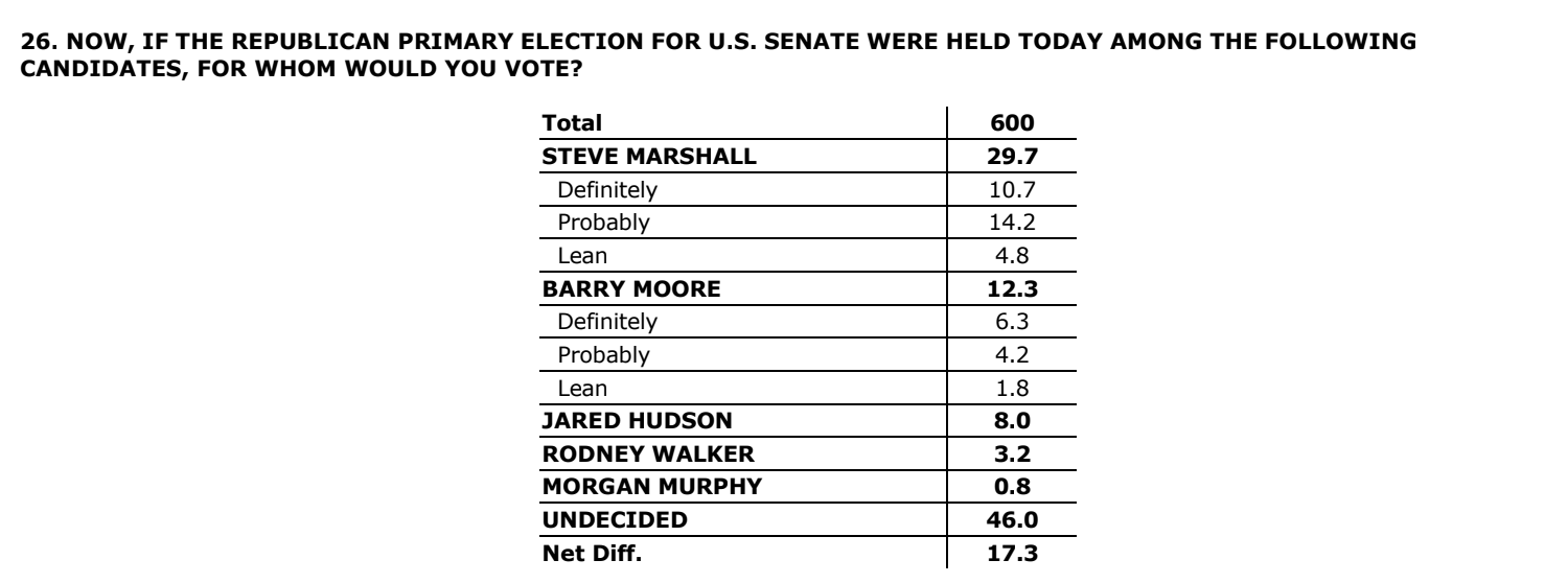 Marshall is term limited in his current office and running for U.S. Senate. The poll showed him leading that filed with 29.7%, followed by U.S. Rep. Barry Moore, 12.3% and 8% for former Navy Seal Jaren Hudson. Forty-six percent of respondents were undecided.