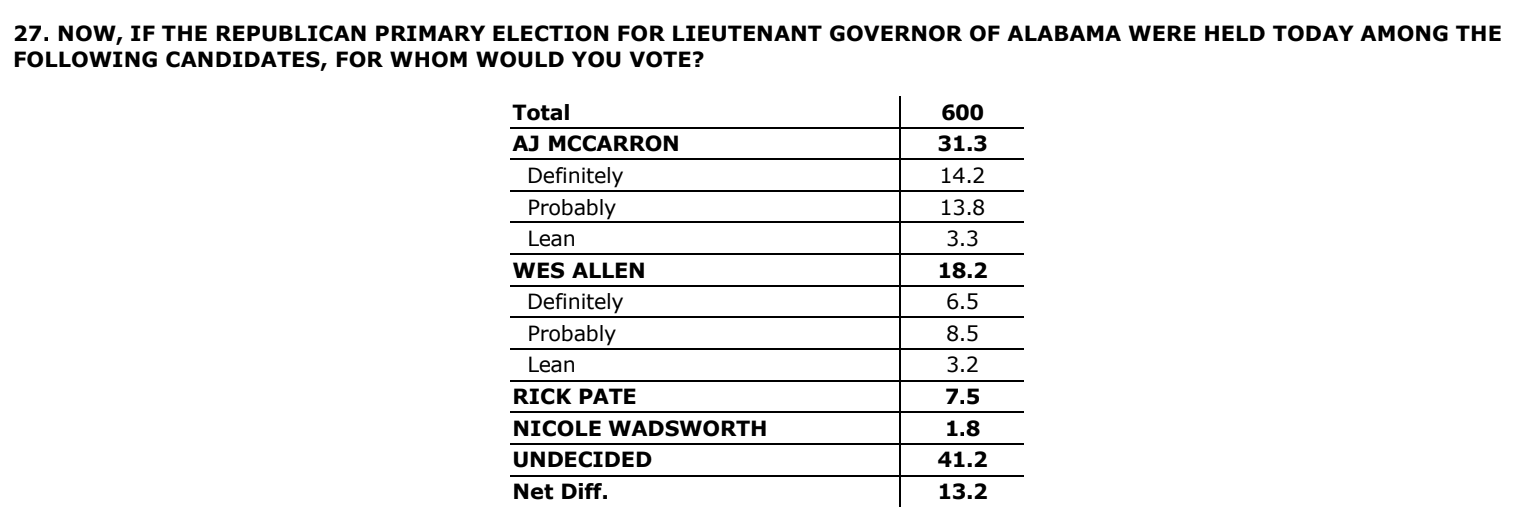 A.J. McCarron, the former Alabama and NFL quarterback whose bid for lieutenant governor lasted less than two months, had the most support at 31.3%. McCarron ended his campaign just after the poll was conducted. About 18.2% of the polled would have voted for Wes Allen, the current secretary of state, if the election were that day. And 7.5% favored current Alabama Commissioner of Agriculture and Industries Rick Pate.