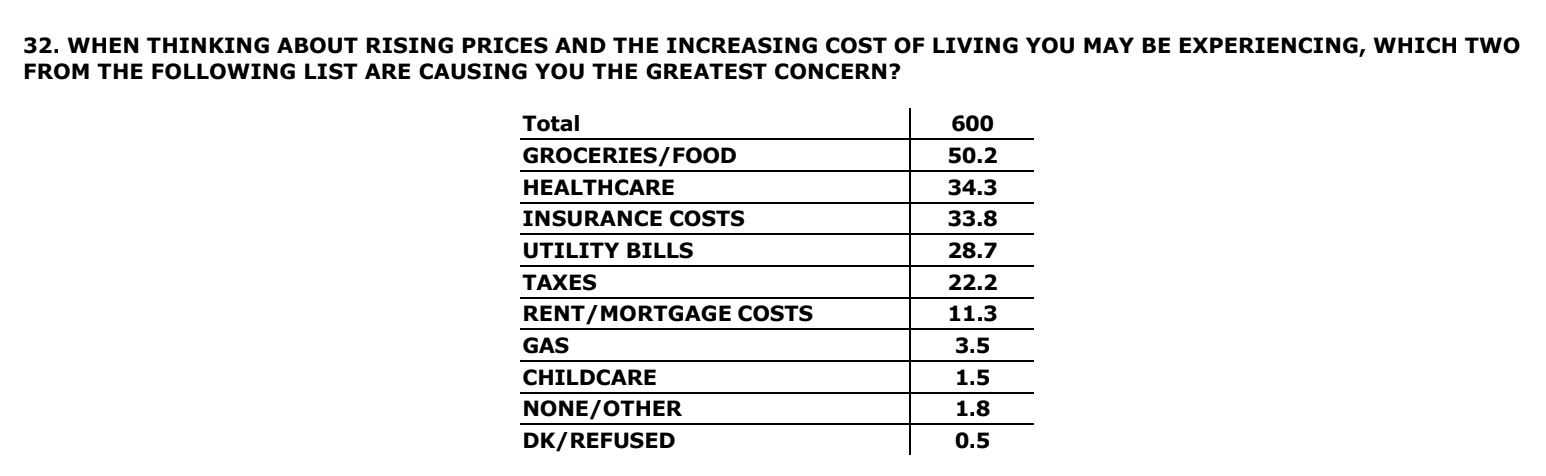 Asked about their two biggest concerns regarding increased prices, 50.2% listed the cost of food, 34.3% said health care and 33.8% said insurance.