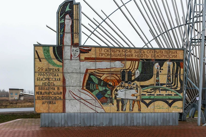 Soviet stele with the mosaic panel “To the Discoverers of Belarusian Oil”. Photo: av.by