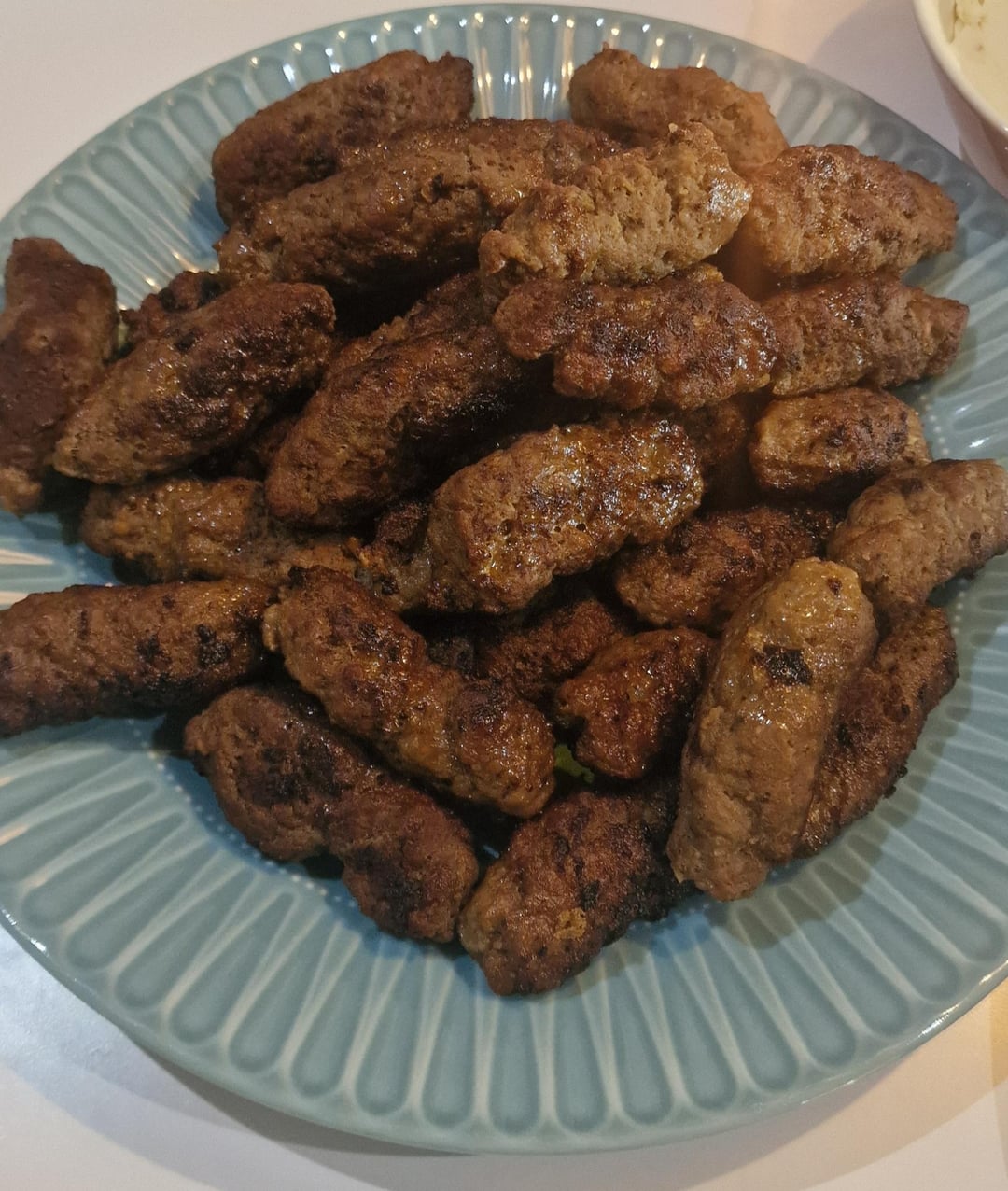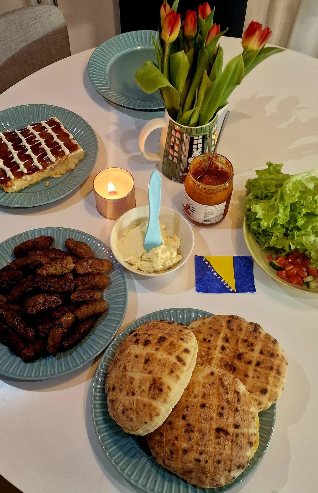 This week the election fell on Bosnia. It was cevapci with bread, ajvar, kaymak, pita bread and salad. For dessert trilice. Recipe from Zeina’s kitchen.