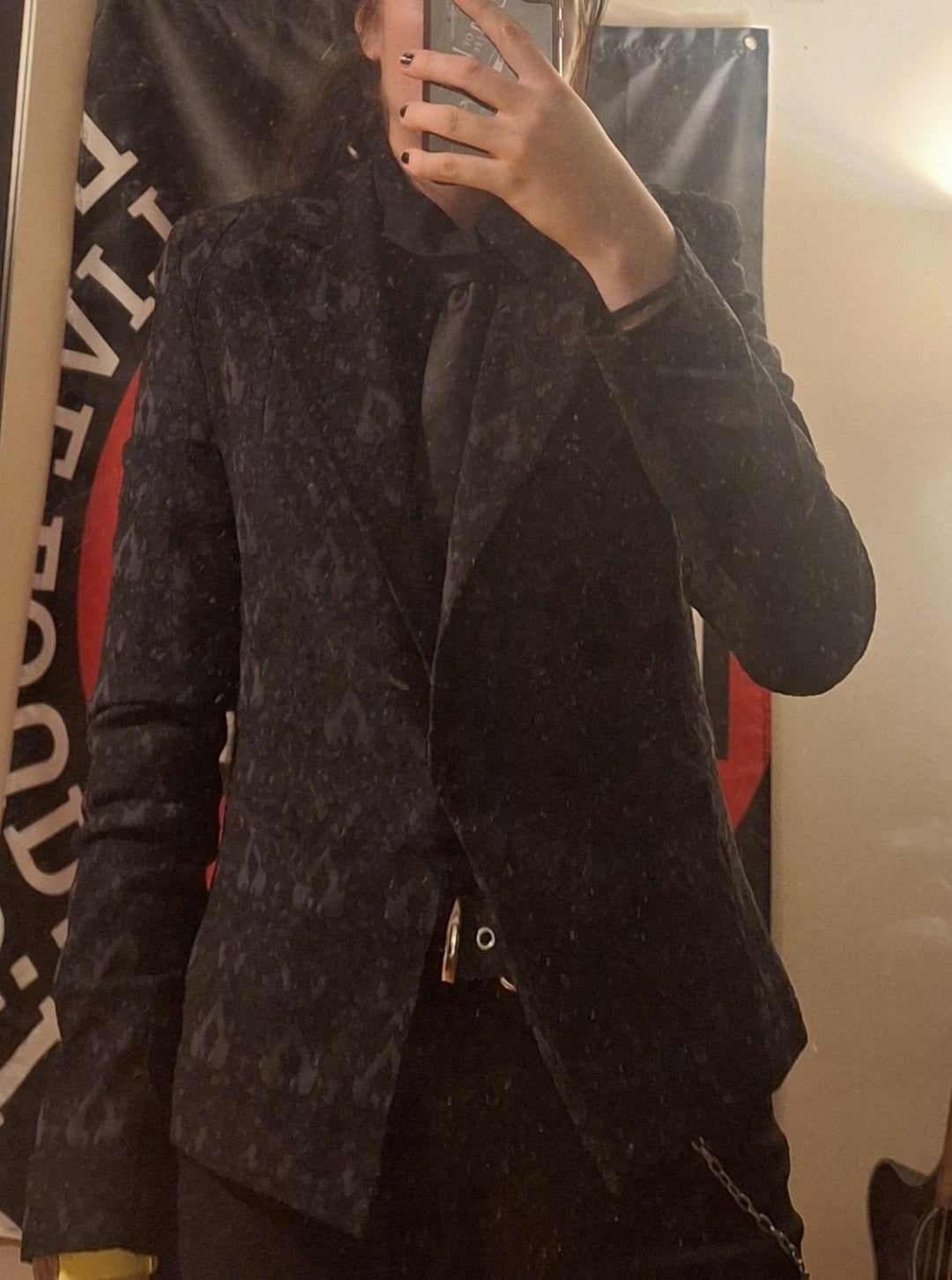 It’s black so that always goes for a ball even if the style is unconventional – alas if you can carry it and feel comfortable than that is all that counts. Tbh the pics are so bad it’s hard for me to say much BUT I like the jacket. The corsage – nope. The zipper just doesn’t work with the ensemble. The gilet would work too – especially with the tie alas: are you in love with those safety pins or could we maybe find another creative solution (even together)? I do have a sewing machine and I’m a constant at Müller in Kritzendorf where one can find tons of artsy stuff to pep things up (I mean one can even spark up safety pins if nothing else works). Feel free to hit me up if you want some help!