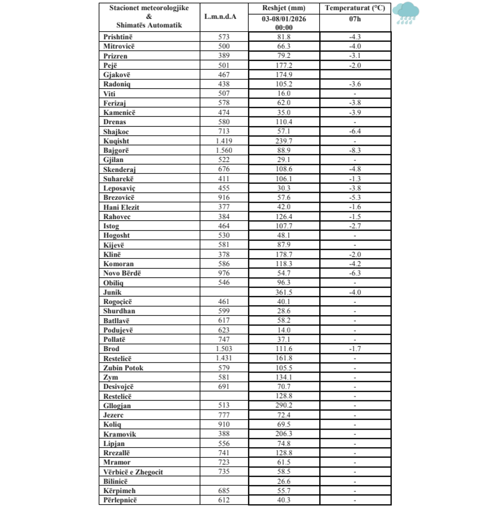 The Hydrometeorological Institute of Kosovo (IHMK) has announced that during the period from January 03, 2026 to January 08, 2026, at 00:00, significant rainfall was recorded in the territory of the Republic of Kosovo.