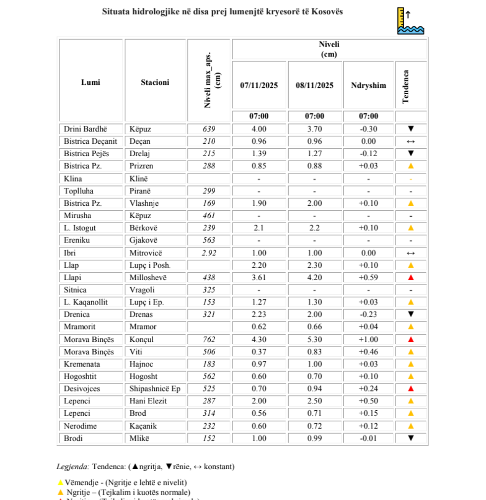 The announcement states that currently most of the country’s rivers are in a slight decline, except for the rivers: Drini Bardhë downstream, Sitnica, Morava e Binçës, Lepenci, which have a slight rise.