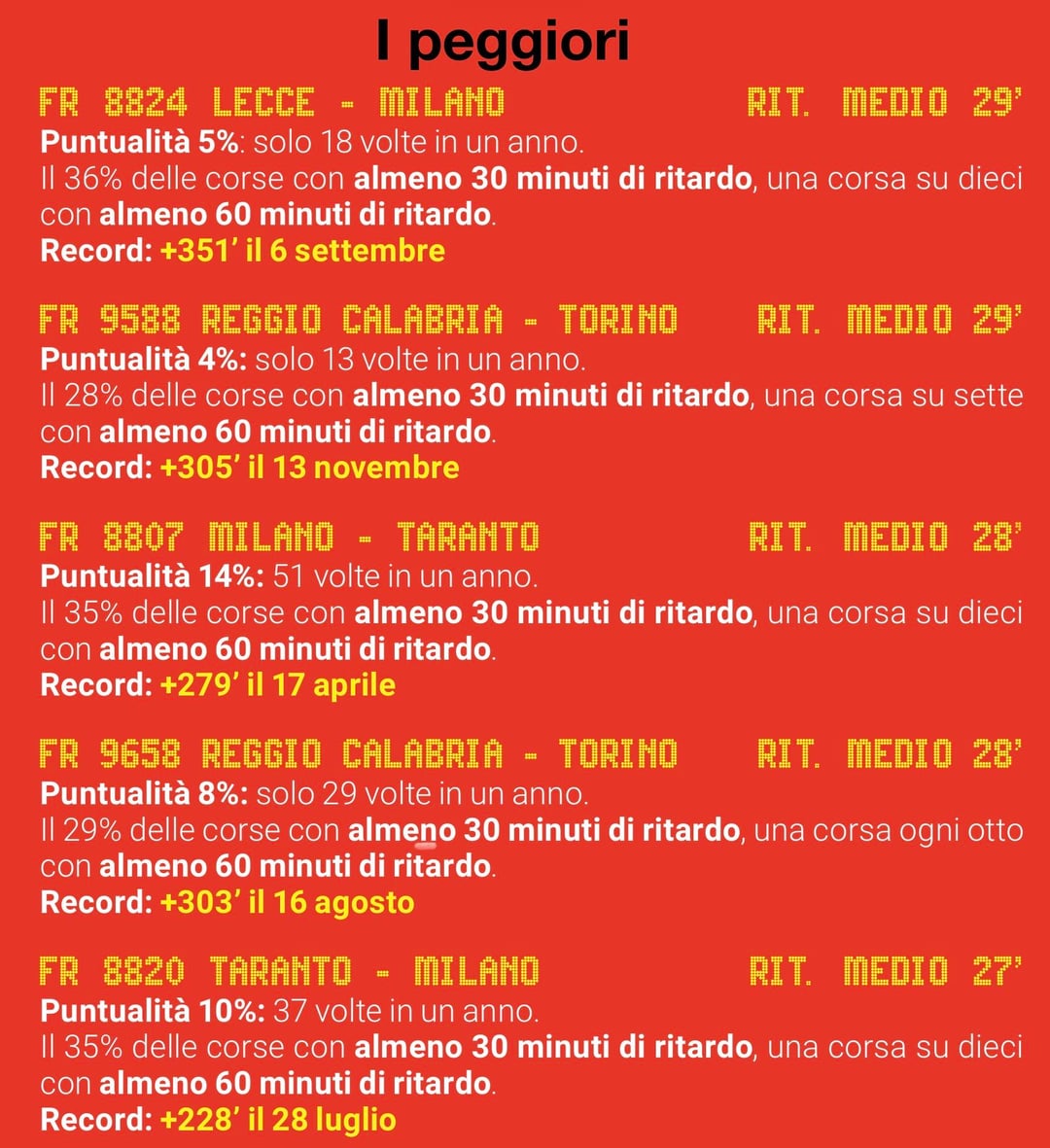 5. Ora i treni non sono fantastici eh, ma considerare ritardo che quelli che arrivano 1 minuto dopo non mi sembra utile, se no poi per evitare di far figurare questo ritardo allungano i tempi di percorrenza dichiarati, con danno per tutti.