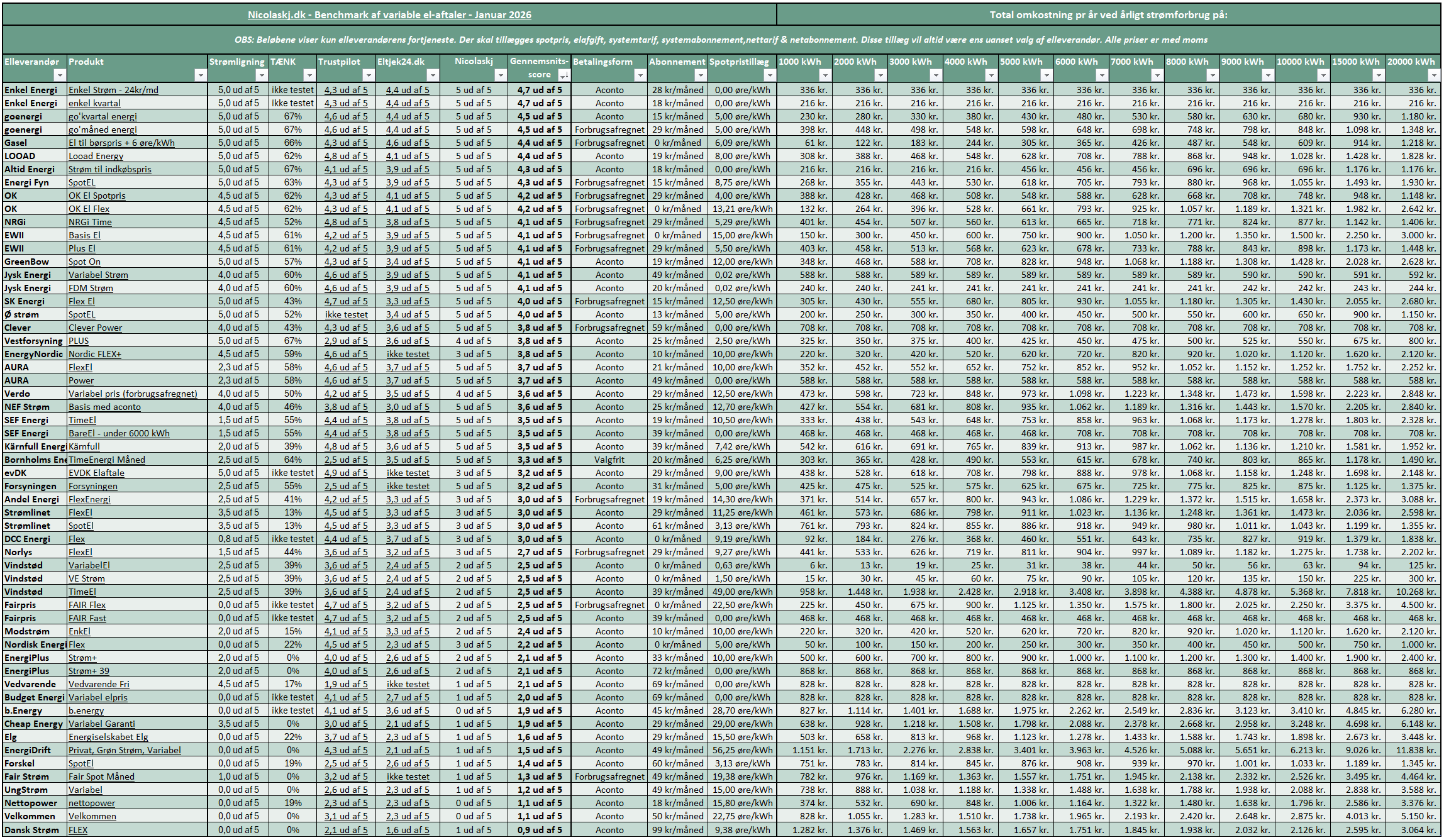 Get the spreadsheets themselves with variable agreements, fixed electricity contracts and with limited time offer agreements and read more about the different scores here: https://nicolaskj.dk/