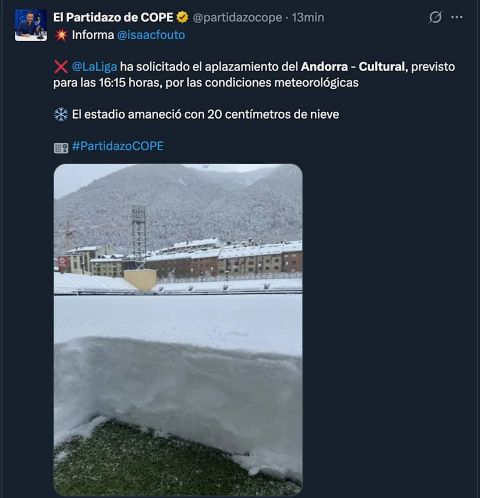 The weather shows no mercy and, in light of the heavy snowfall in Andorra, the match between the Andorran club and Cultural Leonesa has been forced to be suspended due to the intense snow.