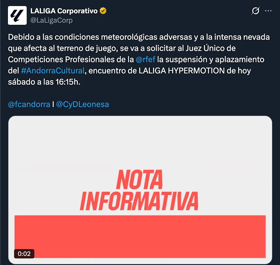 La Liga has submitted a request to the Competition’s Sole Judge to suspend and postpone the match, as the weather conditions are extreme.