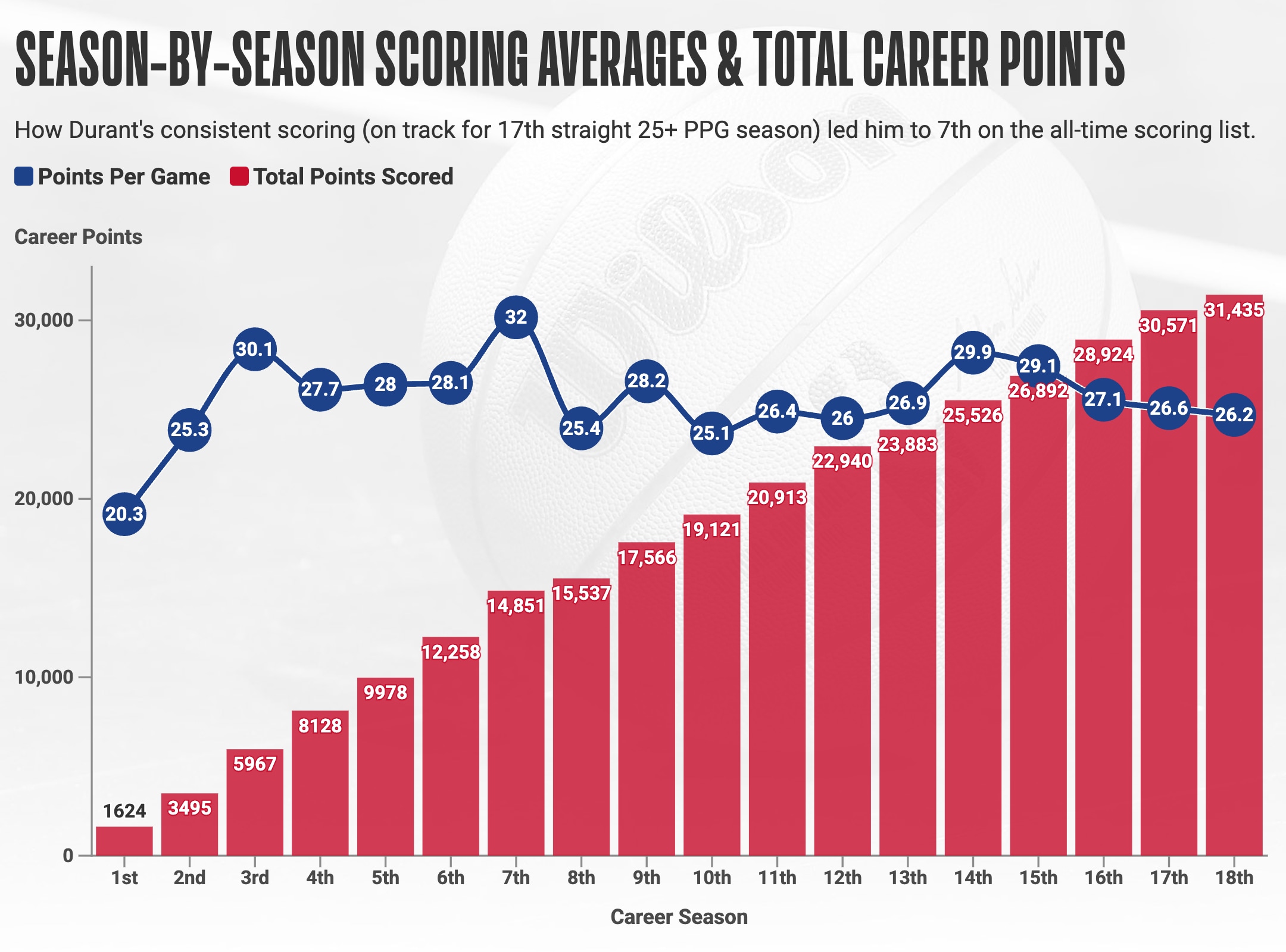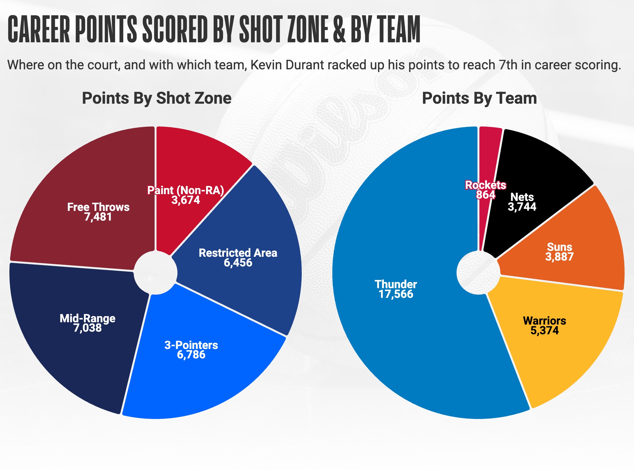 Kevin Durant drains 3-pointer, moves up to No. 7 on career scoring list.