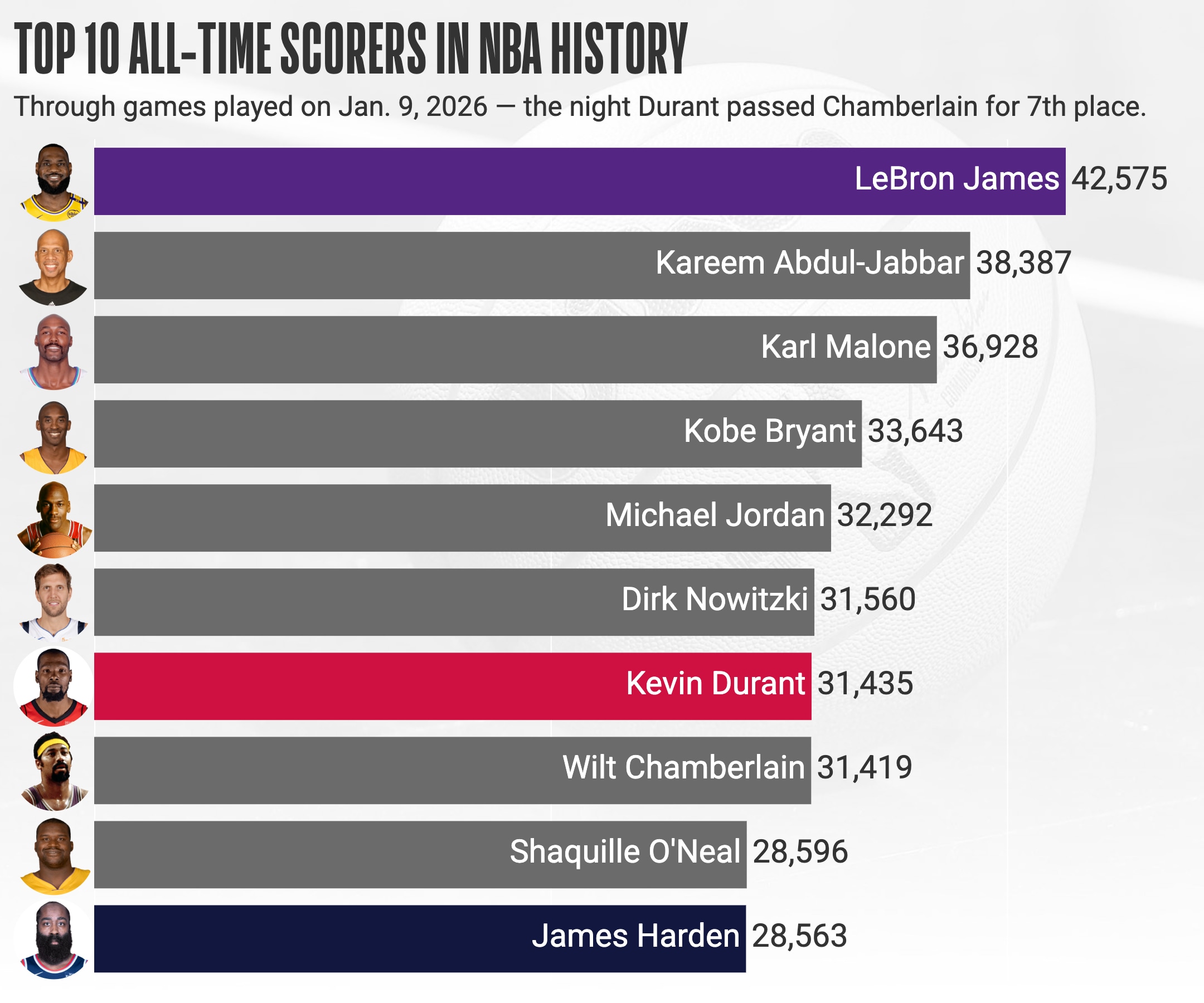 Durant needed 15 points going into the game to eclipse Chamberlain, who scored 31,419 points. Durant’s jumper with 7:57 left in the third gave him 31,422.