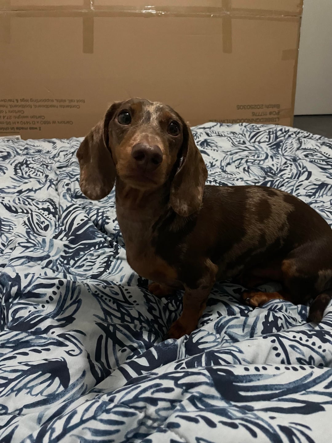 “Just saw a dachshund running loose on the carew street towards to kedrobn, Looks scared and was moving fast. I lost him , might got into kalinga park”. There’s blurry pics of a daschund of the same colouring (too blurry to see if there is mottle thought