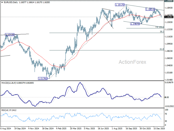 EUR/USD’s extended fall last week suggests that rise from 1.1467 has completed at 1.1807 already. Fall from there is seen as the third leg of the corrective pattern from 1.1917. Initial bias stays on the downside this week for retesting 1.1467. Break there will pave the way to 100% projection of 1.1917 to 1.1467 from 1.1807 at 1.1357. ON the upside, above 1.1682 minor resistance will turn intraday bias neutral first. But risk will stay on the downside as long as 1.1807 resistance holds, in case of recovery.