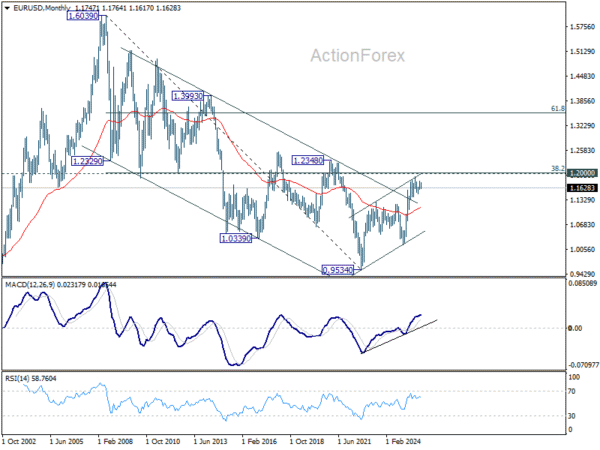 In the bigger picture, as long as 55 W EMA (now at 1.1406) holds, up trend from 0.9534 (2022 low) is still in favor to continue. Decisive break of 1.2 key psychological level will carry larger bullish implication. However, sustained trading below 55 W EMA will argue that rise from 0.9534 has completed as a three wave corrective bounce, and keep long term outlook bearish.