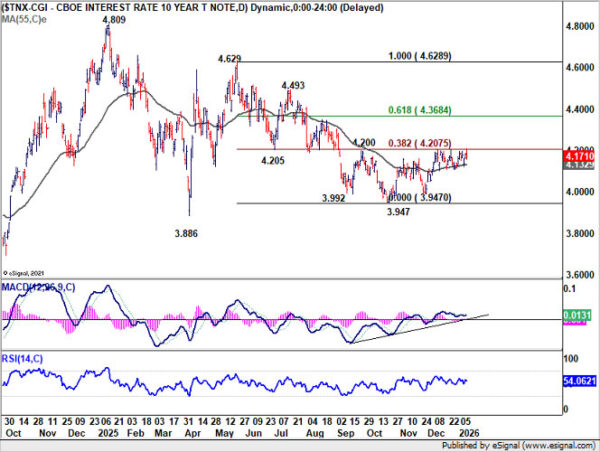 Treasury yields is also a critical missing link in determining whether Dollar’s rebound can evolve into something more durable. For now, US 10-year yield is locked in a narrowing range, repeatedly finding support at the 55 D EMA (now at 4.136), while failing to generate enough momentum to clear the 4.200 cluster resistance (38.2% retracement of 4.629 to 3.947 at 4.207) decisively.