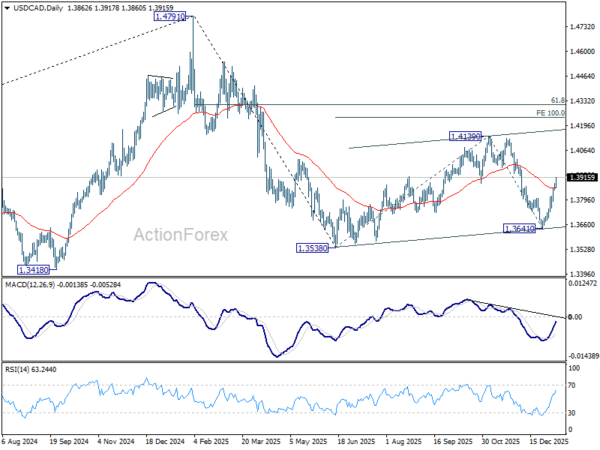 Technically, price action in USD/CAD mirrors that fundamental shift. Last week’s strong rally suggests decline from 1.4139 has completed as a correction at 1.3641. The advance from there is now seen as the third leg of a broader corrective pattern originating from 1.3538. That opens the scope for a retest of 1.4139, and possibly further to 100% projection of 1.3538 to 1.4139 from 1.3641 at 1.4242.