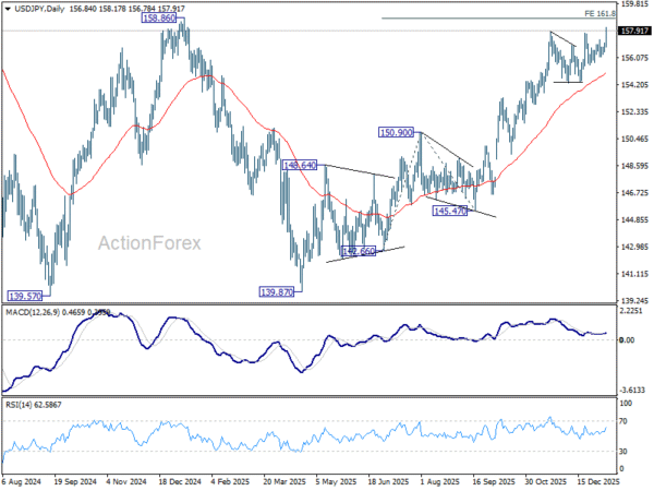 If Nikkei does push toward 58k region, USD/JPY is likely to follow toward the 161.94 high. The key risk then becomes policy response: whether Japanese authorities intensify verbal warnings, or ultimately move toward direct intervention should the pair break above 158.86 structural resistance zone.