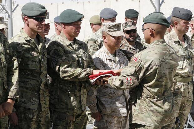 A soldier with the Danish Contingent presents the Denmark flag to Danish Army Col. Micheal Thogersen, DANCON commander, during a flag-lowering ceremony aboard Camp Leatherneck, Helmand province, Afghanistan, July 21, 2014. (Wikimedia Commons)