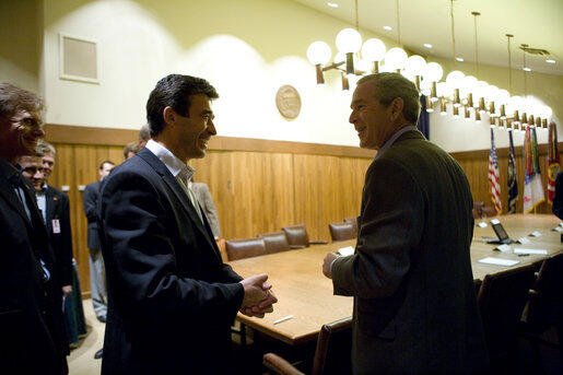 President George W. Bush and Prime Minister Anders Fogh Rasmussen of Denmark meet at Camp David Friday, June 9, 2006. White House photo by Eric Draper.