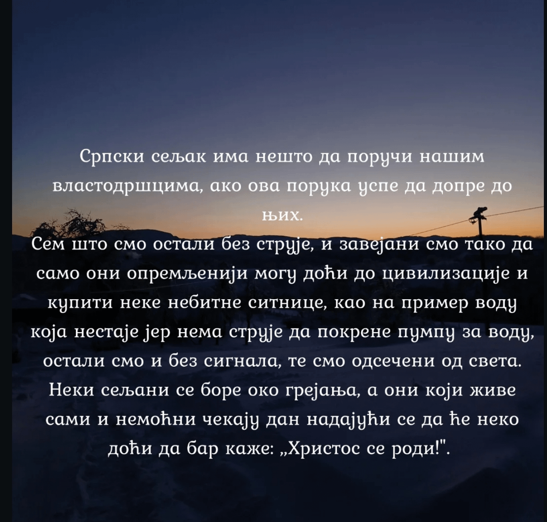 Puna podrška od seljaka iz valjevskog kraja trenutno u Beogradu. Ni moji nemaju struje, mada mi možemo da pređemo u stan u gradu jebiga.