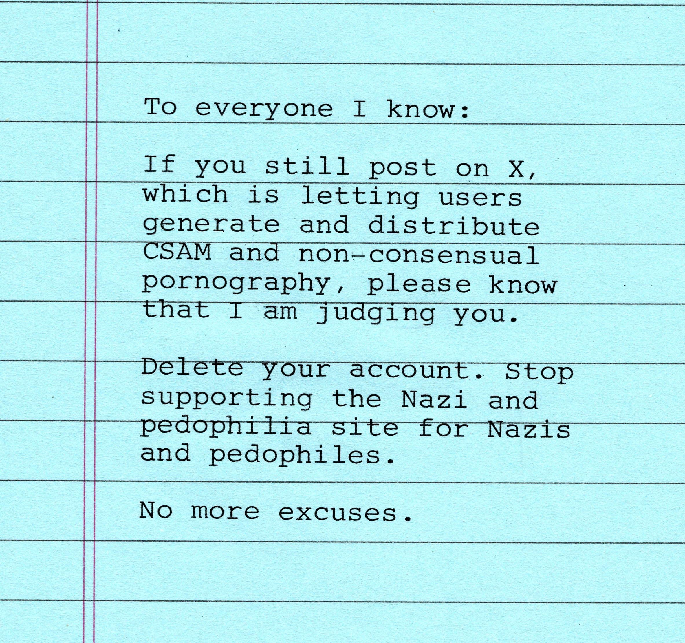 Seriously: If people are hearing that there’s “CSAM bots” and they’re not deleting their accounts, I mean, uh…