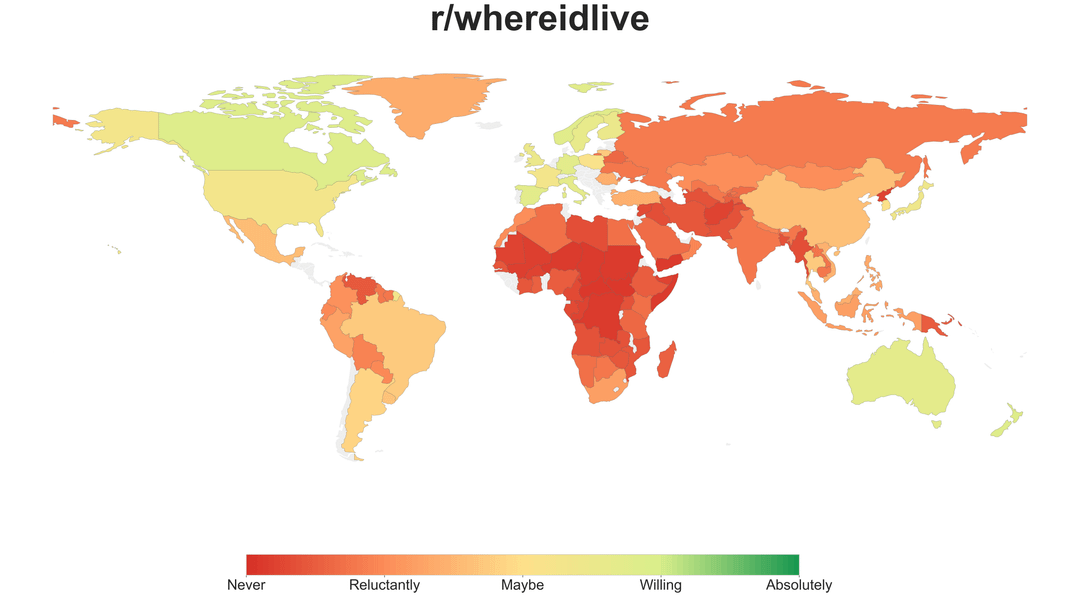 6. I like how you can see a noticeably large group of tankies keeping North Korea from being in the bottom 5. Though, to be fair, while still in the ‘never’ category, I would probably rather live there than any of the countries below it.