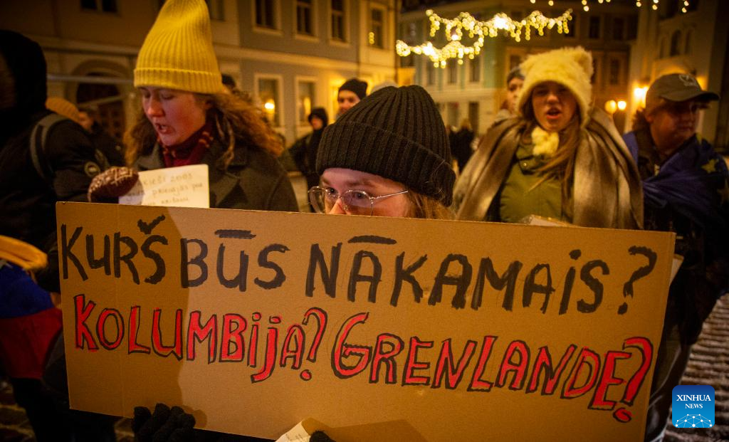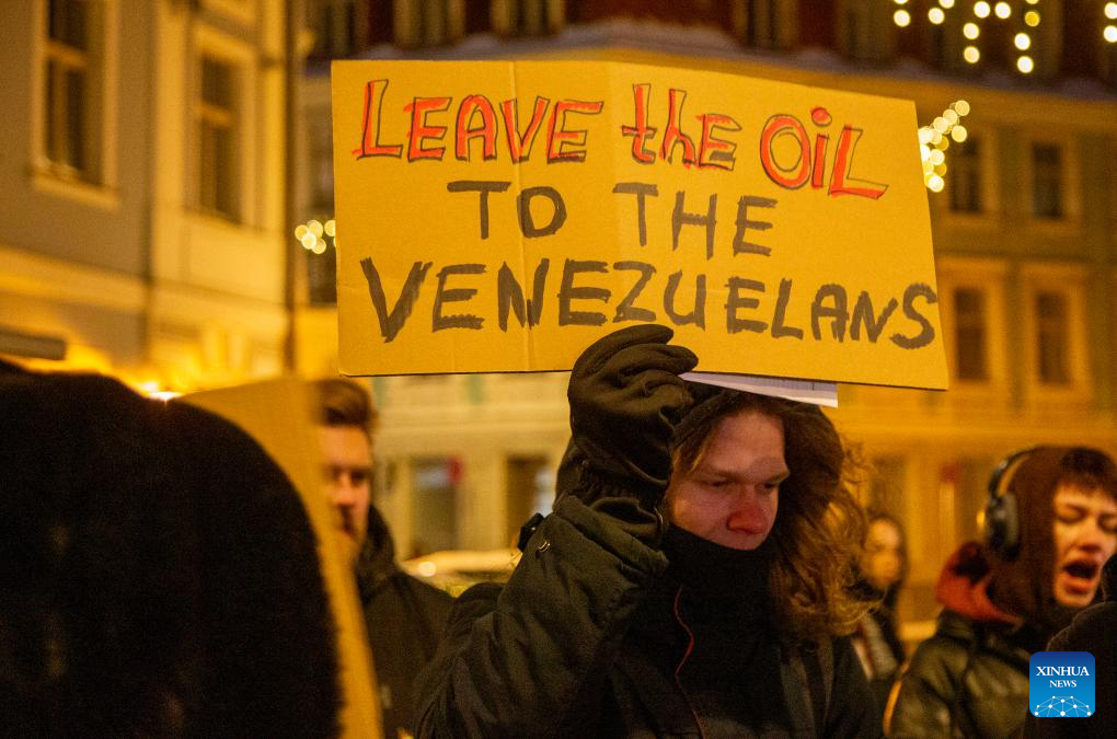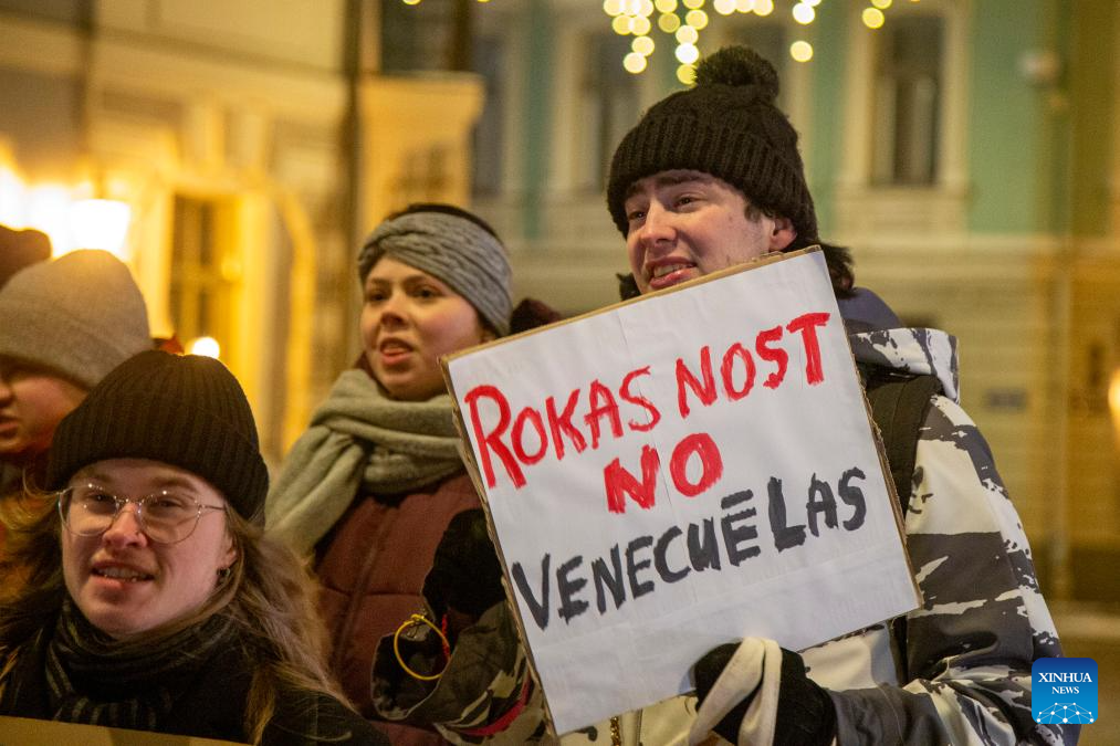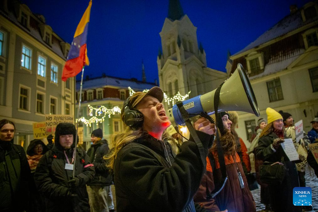 People attend a protest condemning U.S. attack on Venezuela in Riga, Latvia, Jan. 9, 2026. (Photo by Edijs Palens/Xinhua)