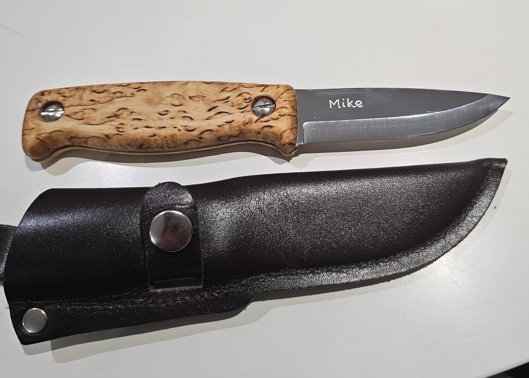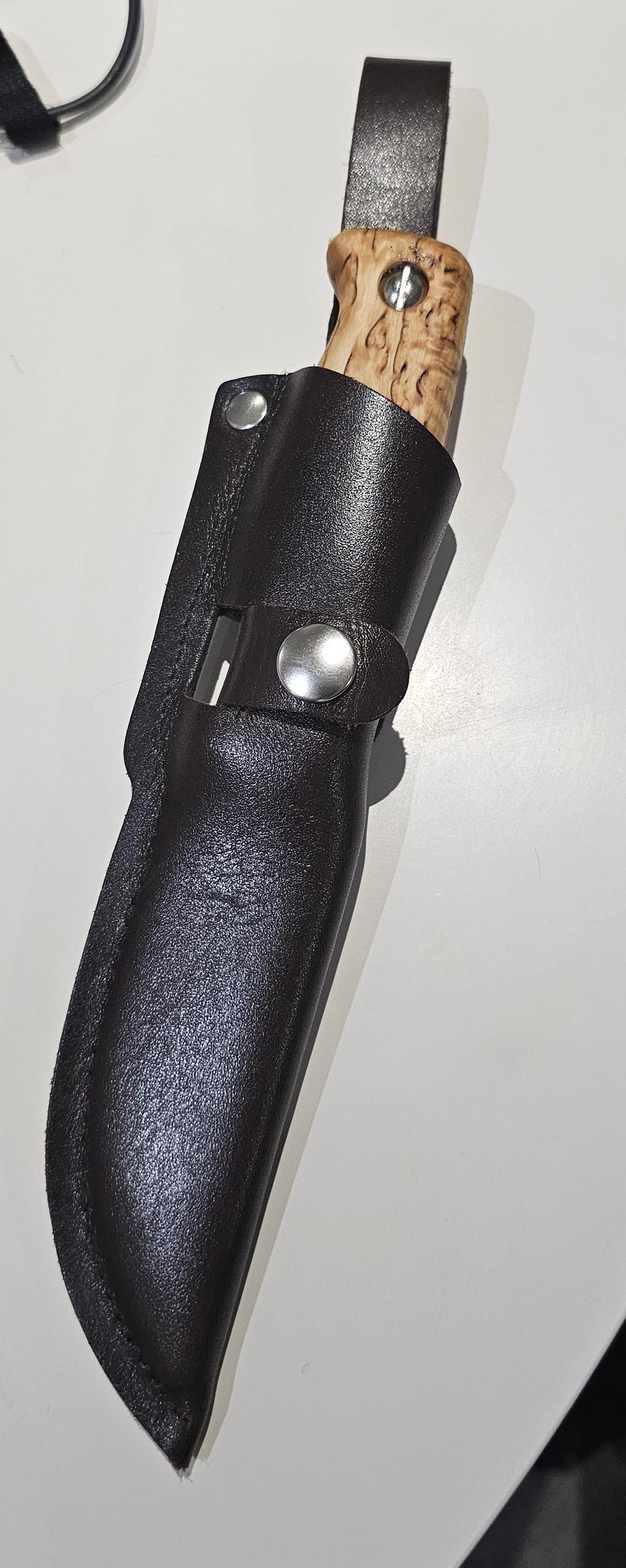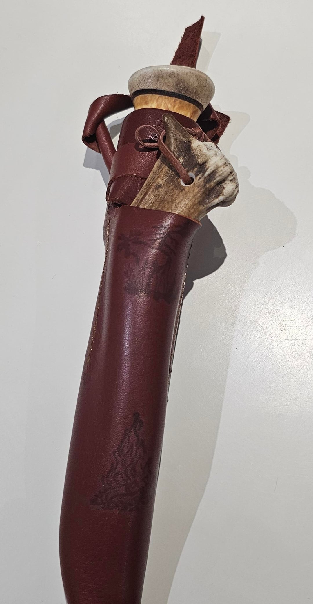 Picked up a nice reindeer antler and ferrocerium rod kit (note the striking groove on the spine), and also a full tang with curly birch handle.