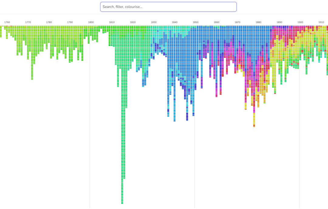 – Visualise frequency of key, genre, forces, and so on over time.