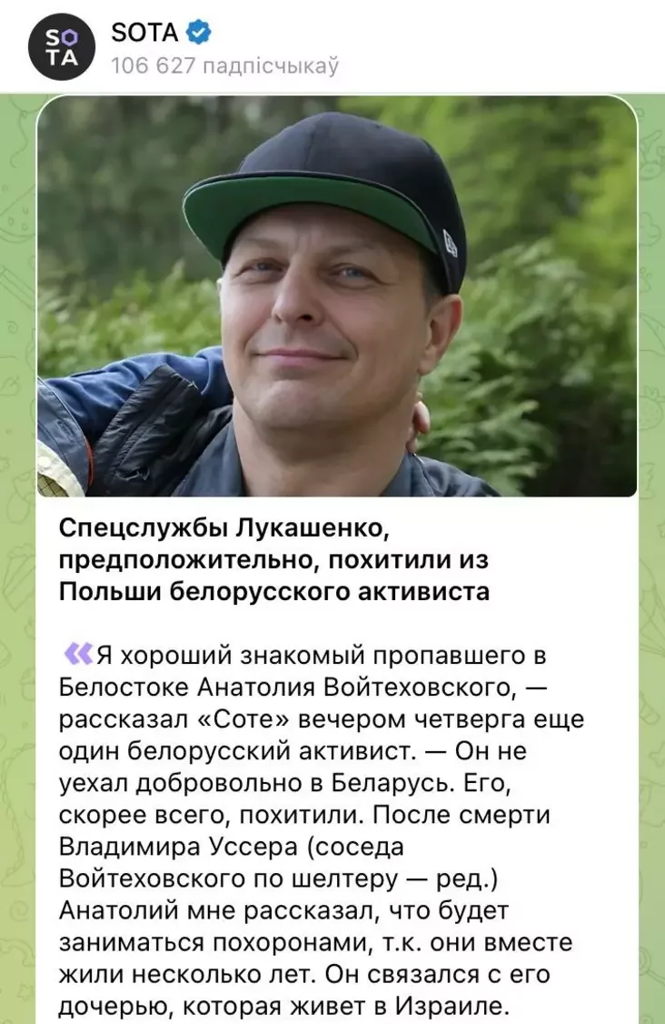 Before this, Anatol Vaitsyakhouski, who was evacuated by “Bysol” in 2023 due to political criminal persecution, wrote to the repatriation commission. He brought from Poland documents related to the criminal case of his deceased spy neighbor Uladzimir User.