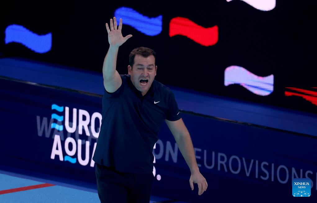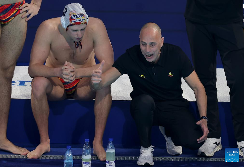 Spain’s head coach David Martin (R) gestures during the group C match between Spain and Serbia at the Men’s European Water Polo Championships in Belgrade, Serbia, Jan. 12, 2026. (Photo by Predrag Milosavljevic/Xinhua)