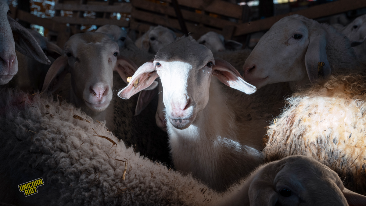 Sheep huddle in a stable on a Greek farm.