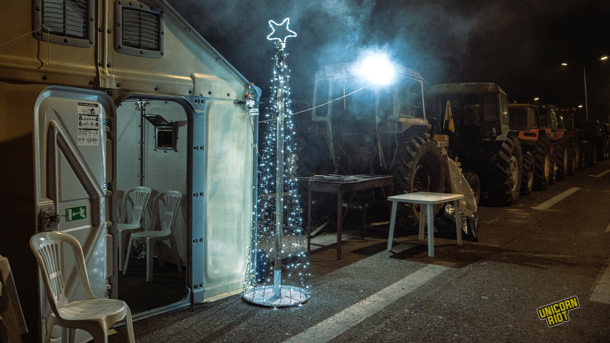 A Christmas tree lights up the tractor blockade over the 2025 holiday season.