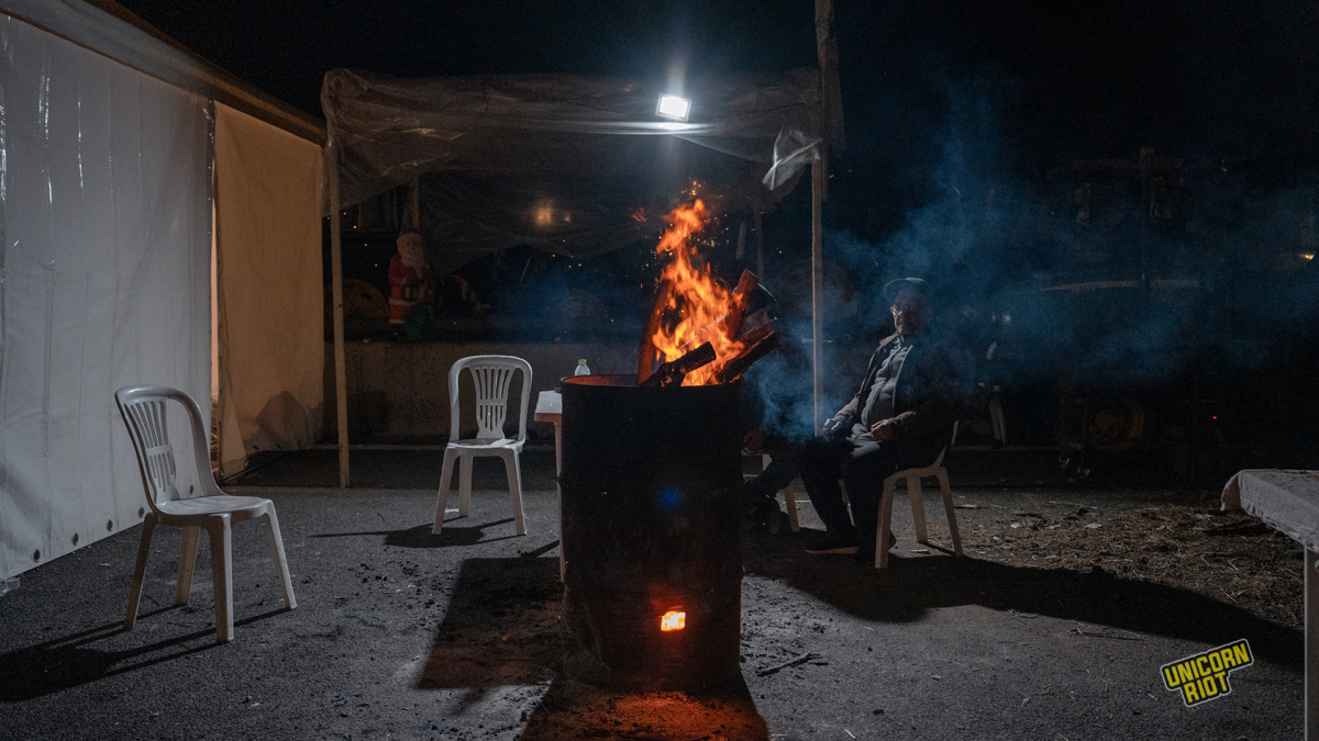 At the blockades, people of all ages gather — men and women who have taken part in past mobilizations alongside those protesting for the first time. As evening falls, fires are lit from wooden pallets and scrap metal barrels. Coffee is poured, cigarettes shared. Conversations stretch late into the night.