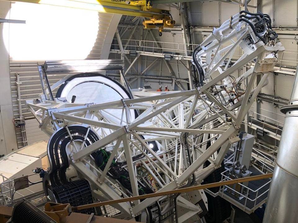 The Thirty Meter Telescope is shown at a very low elevation angle in this digital rendering. The segmented primary mirror reflects the convex secondary mirror. The tertiary mirror in the center of the primary mirror is oriented to send light to the Wide Field Optical Spectrograph, the gray structure located on the right side of the image: one of the observatory’s main instruments. The left and right instrument platforms are seen and the dark blue adaptive optics enclosure is seen on the upper left on the instrument support structure. Once considered the next-generation flagship project of US astronomy in the Northern Hemisphere, it is now deemed unlikely to be built in the United States after all.