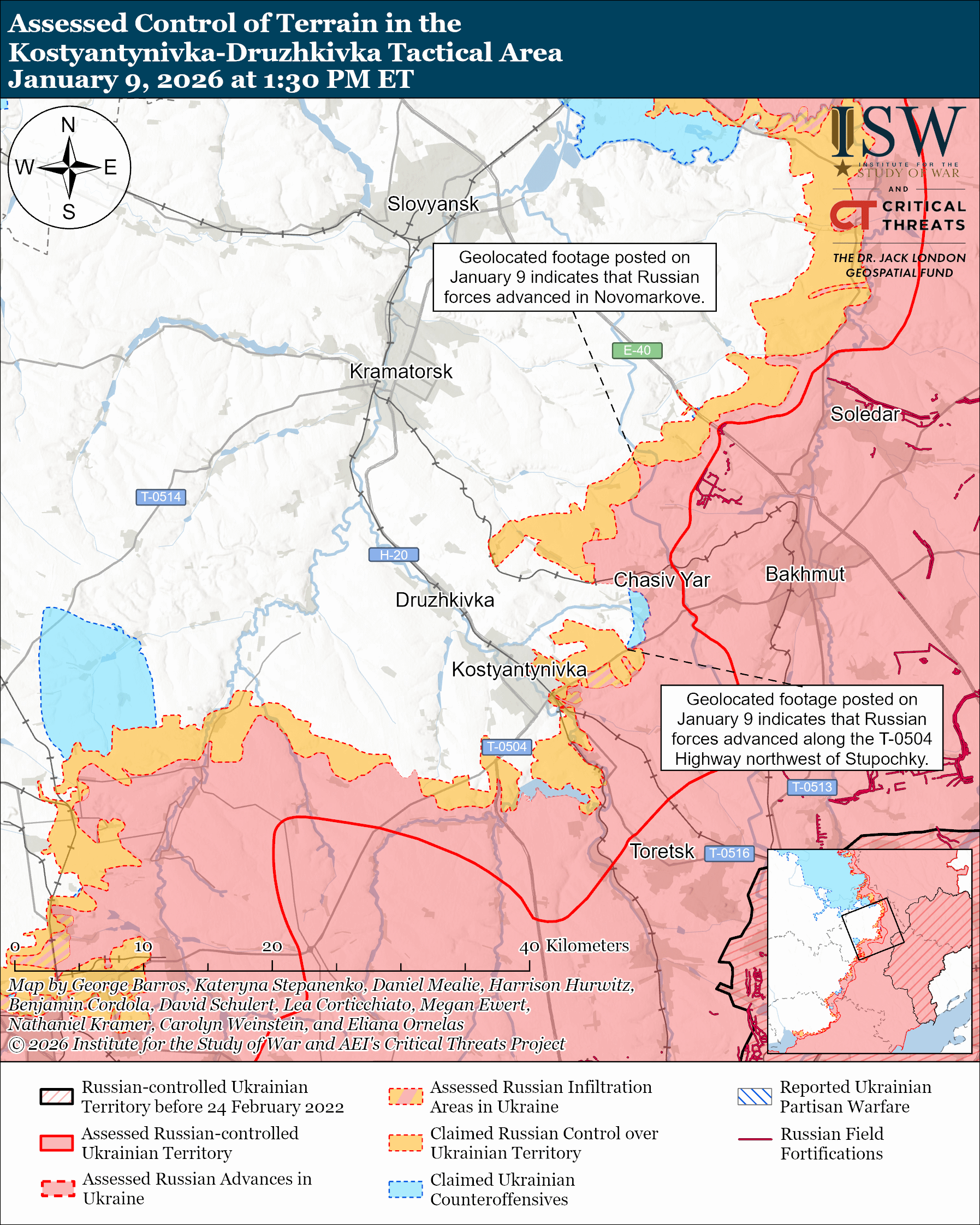 Assessed Russian infiltrations: Geolocated footage published on January 9 shows Ukrainian forces striking Russian positions east of Kostyantynivka, during what ISW assesses was a Russian infiltration mission that did not change the control of terrain or the forward edge of the battle area (FEBA) at this time.[lxi]